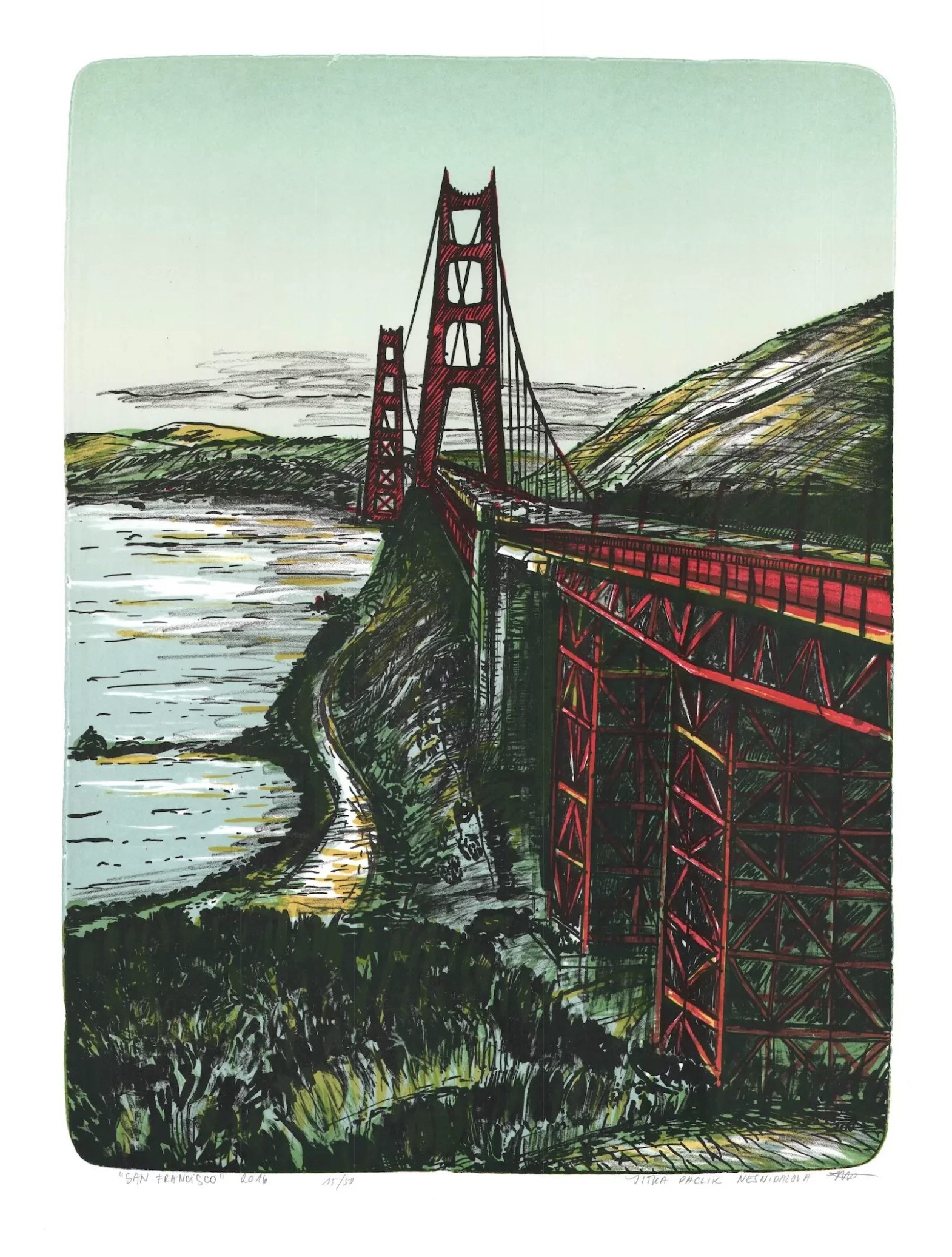 Opět tu zaznělo slovo malba. Jitka Nesnídalová je opravdu především malířka. My ale jsme rádi, že se zatoulala i do oblasti grafiky. Tu s její malířskou tvorbou spojuje řada společných námětů a suverénní zacházení s barevností. To je něco, co musí diváka zaujmout na první pohled. Platí to i o výše zmíněném téměř monochromatickém Deliriu tremens nebo jiné litografii s názvem Tate Green.